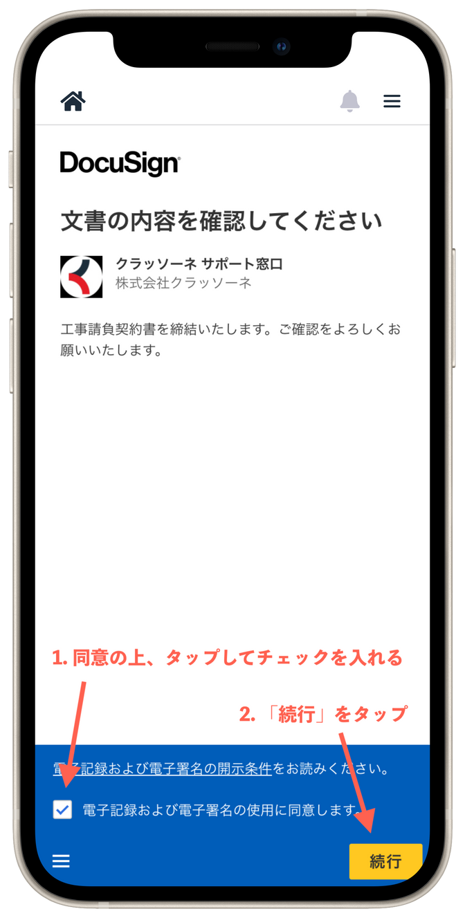 2. 電子署名の利用に同意をして、「続行」をタップする。