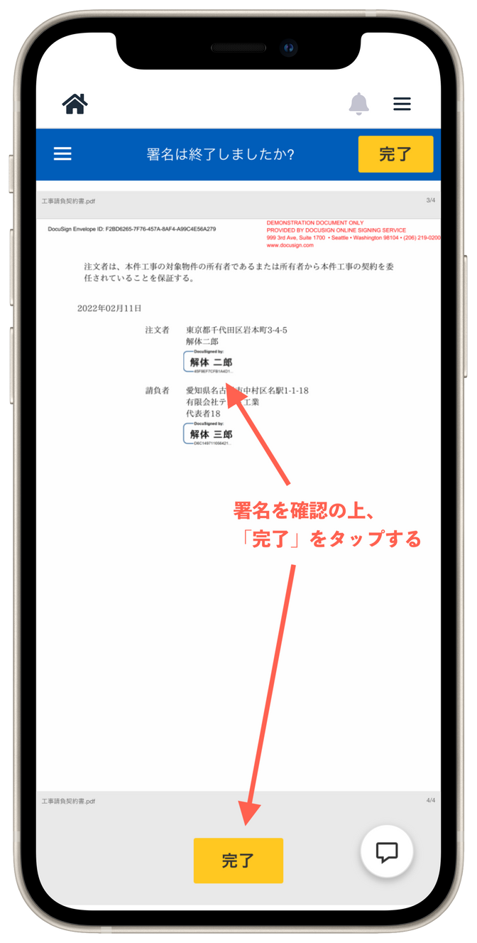 「契約書のサインが完了しました。」という文字が表示されたら署名完了です。