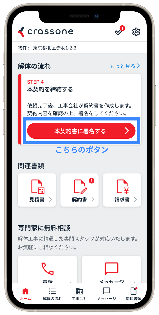 ホーム画面の「解体の流れ」の中にある「本契約書に署名する」というボタンを押してください。