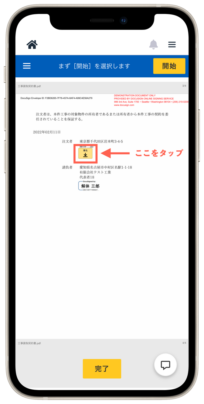 1.ホーム画面で「本契約書に署名する」をタップする。