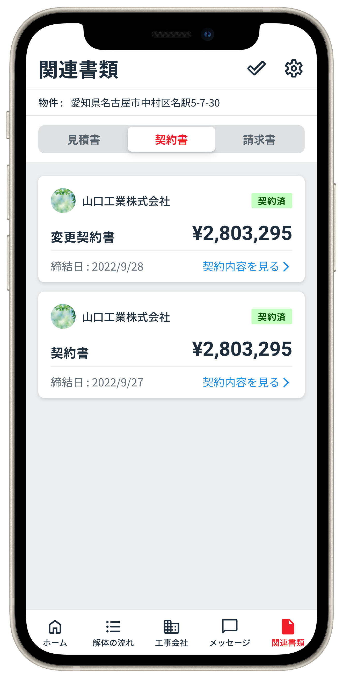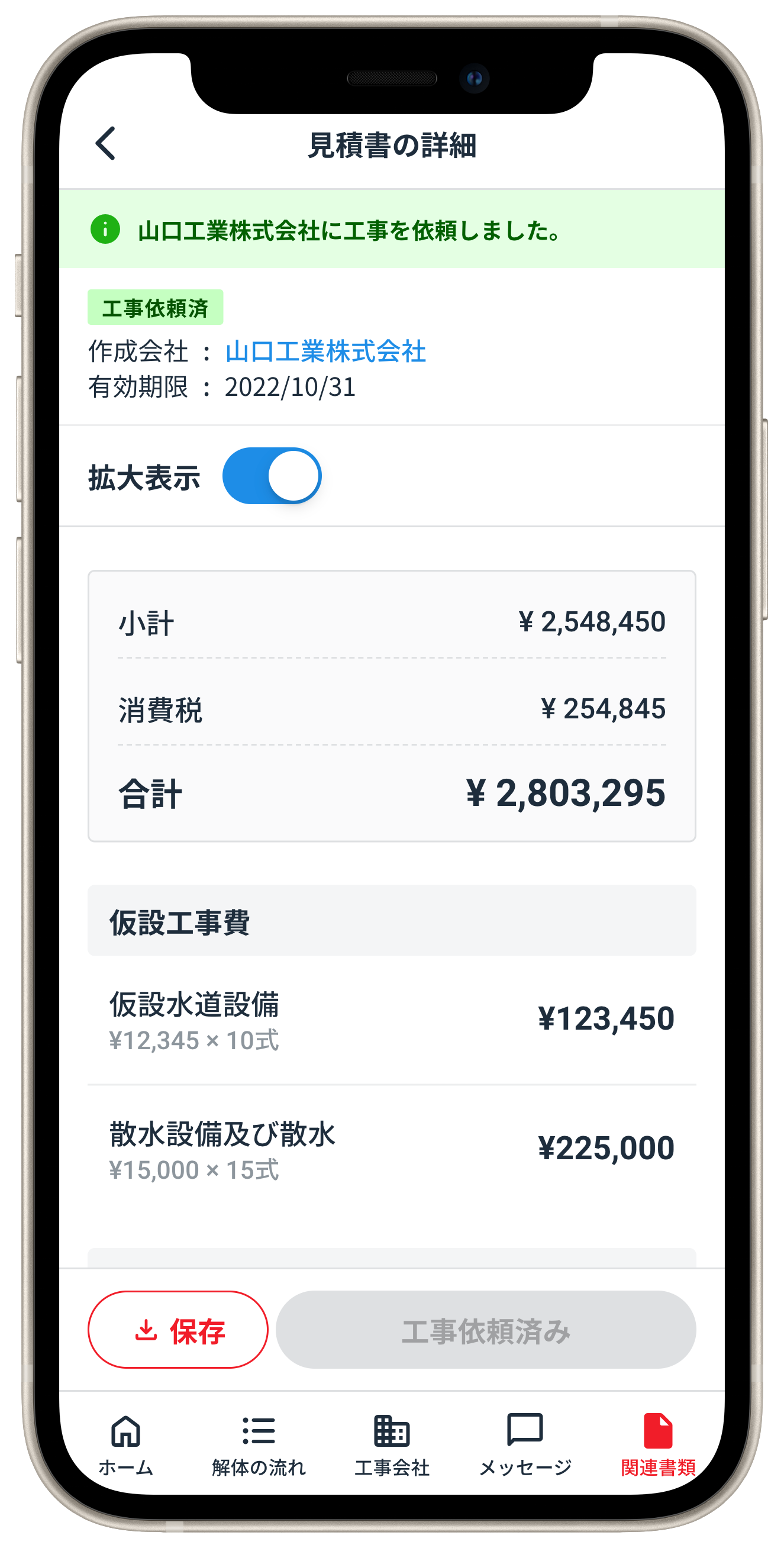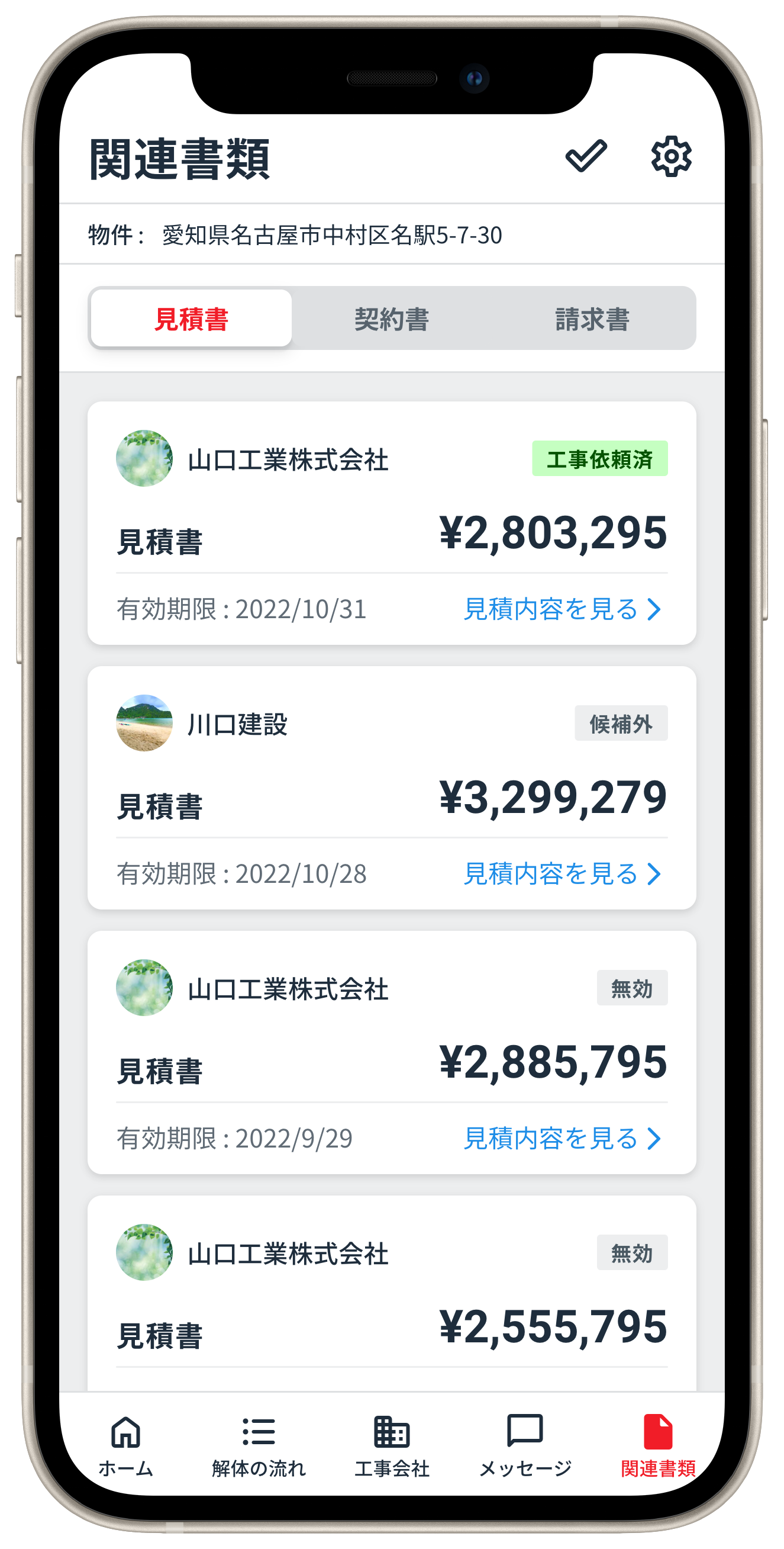 青いリンク(例:見積内容を見る)を押すと詳細な情報を見ることができます。