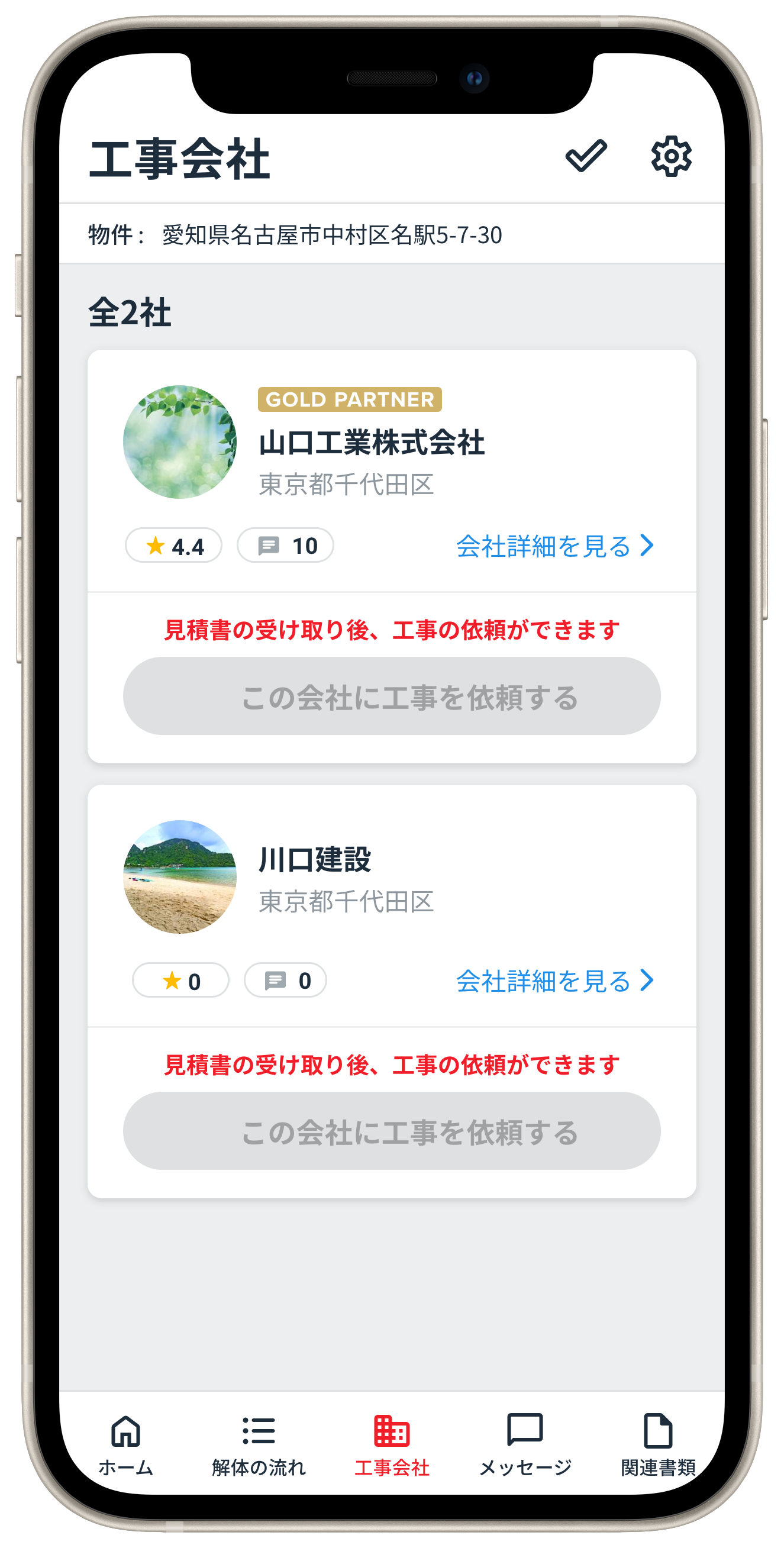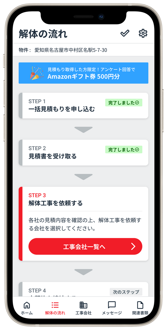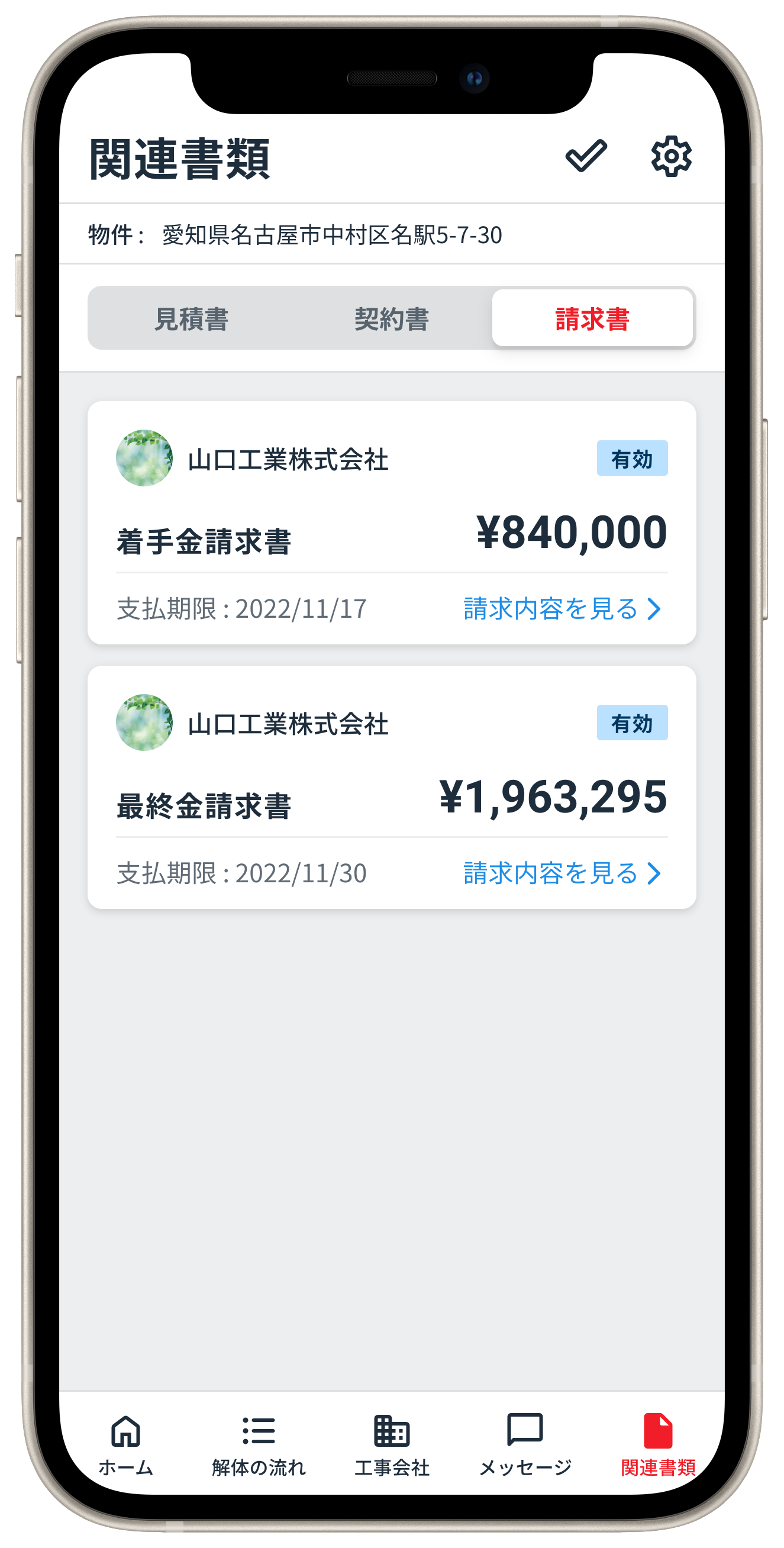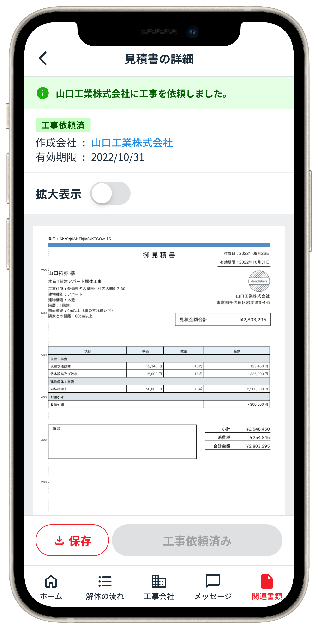 青いリンク(例:見積内容を見る)を押すと詳細な情報を見ることができます。